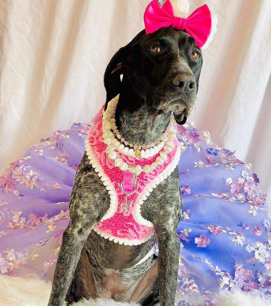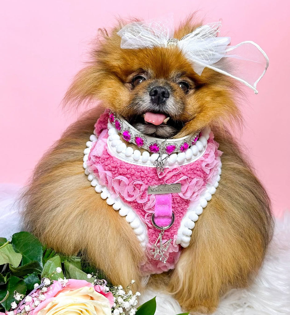 Turn every walk into a runway with this harness, a perfect fusion of comfort and couture for your precious furbaby. Featuring a plush pink sherpa fabric and delicate rosette detailing and soft white pom-pom trim, this harness is designed to be as luxurious as it is functional.