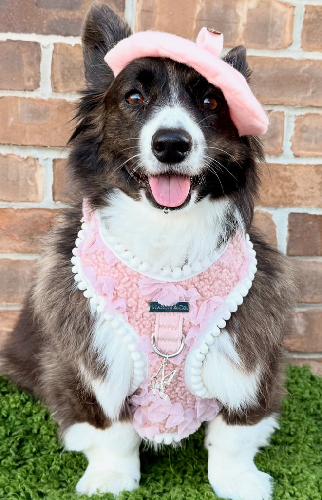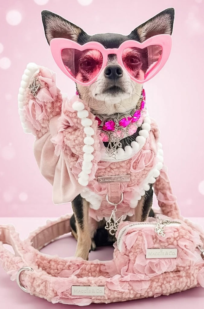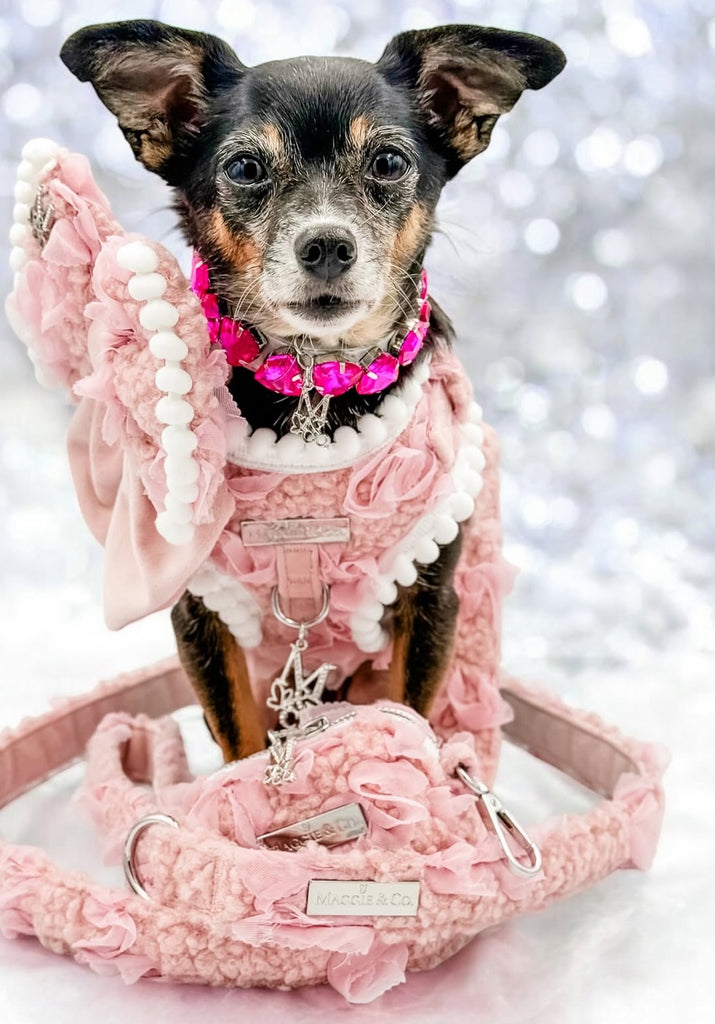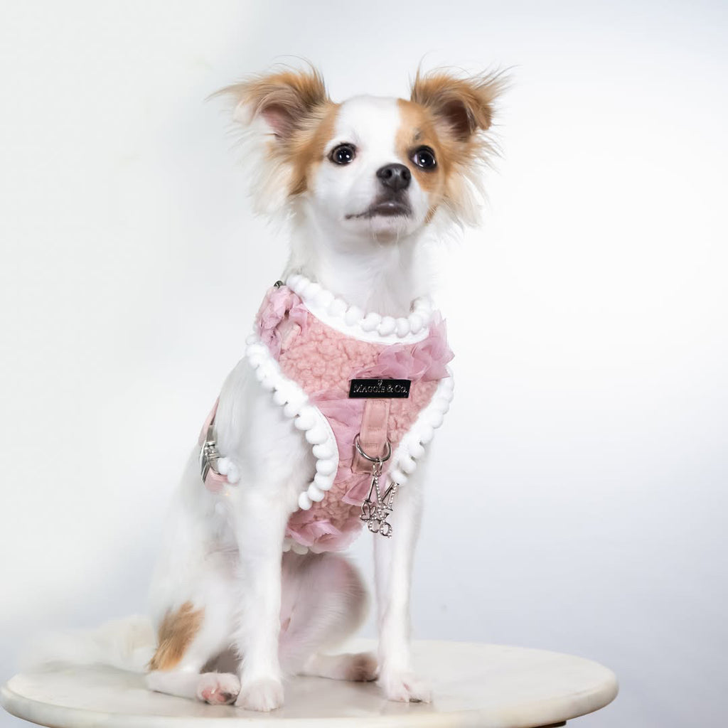 Turn every walk into a runway with this harness, a perfect fusion of comfort and couture for your precious furbaby. Featuring a plush pink sherpa fabric and delicate rosette detailing and soft white pom-pom trim, this harness is designed to be as luxurious as it is functional.