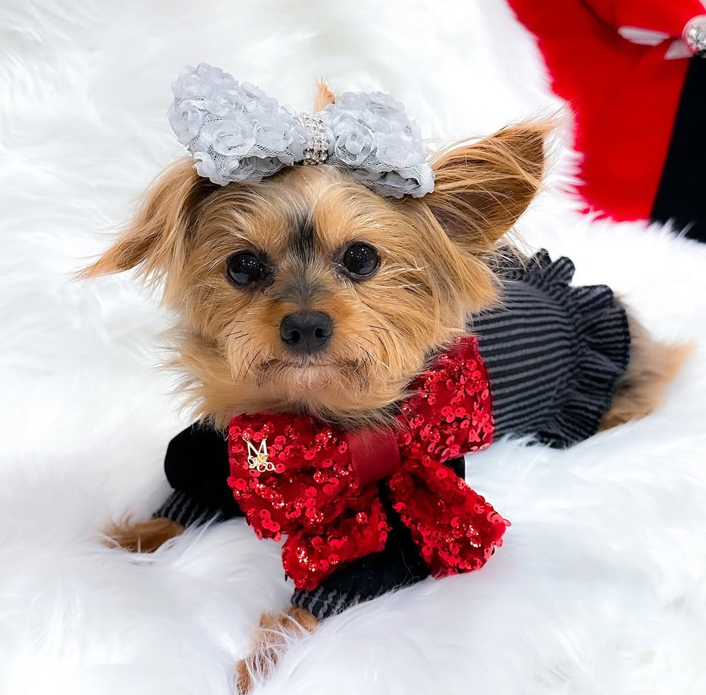 Bow Tie: 5.5” x 4.5” with velcro straps to attach to collar or as hair clip with alligator clip